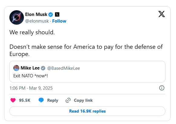 3月9日,亿万富翁、特斯拉CEO马斯克在社交媒体上表态支持美国退出北约,称“美国为欧洲的防务买单是没有意义的”。
